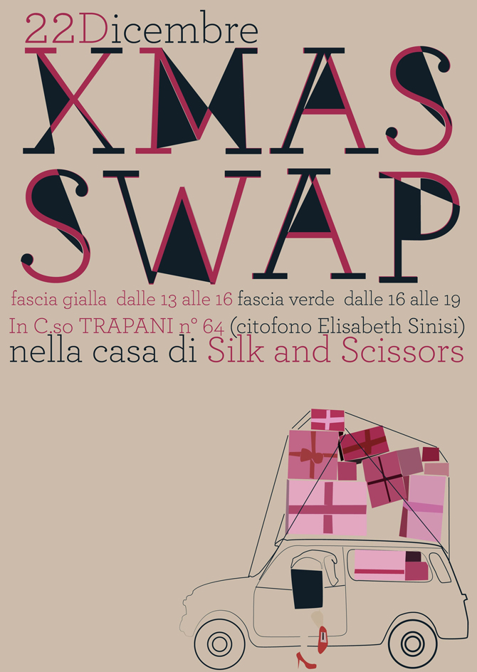 Di nuovo qui per raccontarvi meglio la moda torinese: per chi non lo sapesse Torino sta diventando sempre più fashion and cool.. anche grazie a Elisabeth Sinisi e Marta Lo Bracco di Silk and Scissors!!! I loro eventi modaioli – nail party, swap party, arm candy party – mi stanno completamente conquistando, riuscendo ad ottenere un successo strepitoso in Torino e dintorni! Adesso, però, bando alle ciance perchè un nuovo evento super cool è alle porte, esattamente alla porta di casa di Silk and Scissors! Si tratta del XMAS SWAP PARTY, ovvero il quarto raduno di fashion victims, torinesi e non, pensato per scambiare quei capi/accessori che non abbiamo mai messo o che non ci interessano più per trovarne tanti altri più adatti ai nostri gusti.. insomma, shopping gratuito girls!!! Basta spendere e spandere: rovistiamo nei nostri armadi e buttiamoci nel mondo degli scambi alla pari.. l’appuntamento è SABATO 22 DICEMBRE in Corso Trapani 64 (citofono Elisabeth Sinisi) e l’orario è a vostra scelta!!