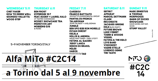 Alfa MiTo Club To Club non è un banale evento di musica ma è uno dei festival di musica, arte e cultura elettronica più importanti in Europa. Quest’anno il #C2C14 celebrerà la sua quattordicesima edizione durante la Contemporary Art Week ( se ancora non l’aveste capito eh ) in giro per varie location torinesi. Si possono andare a sentire i Caribou e Franco Battiato al padiglione 1 di Lingotto Fiere o i Killagroove alla stazione metro Lingotto o ancora i Primitive Art all’Hiroshima Mon Amour. Insomma uno di quegli eventi davvero imperdibili: non fatevi scoraggiare dal prezzo perché esistono pacchetti ad hoc per chi non volesse spendere più di 30€.